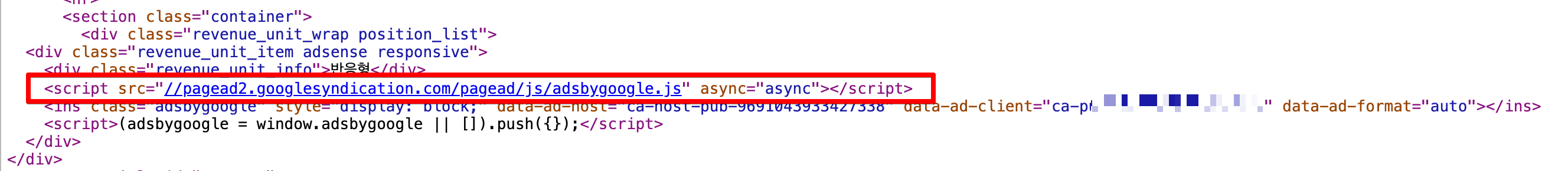그래서 다시 연동을 진행해보니 광고 코드가 제대로 삽입되는 것을 확인할 수 있었습니다. 블로그 홈에서 마우스 오른쪽 클릭하여 소스 보기를 하신 후 아래와 같은 코드가 존재하는지 확인해 보시면 됩니다.