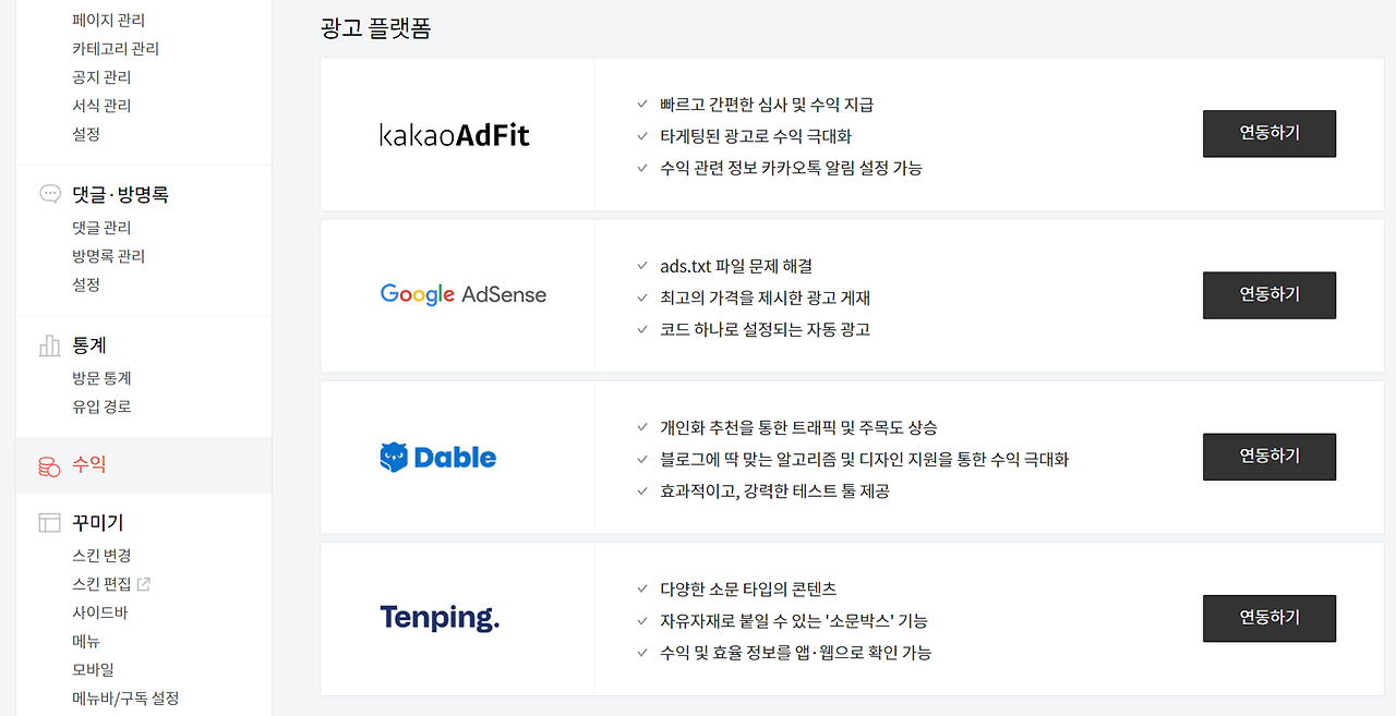 광고코드는 Tistory에서 자동으로 삽입해주기 때문에, 광고 플랫폼 화면으로 가서 Google Ad sense와의 연동이 잘 되어 있는지 다시 확인했습니다. 분명, 아래 페이지에서 연동하기 버튼을 눌러 애드센스를 신청했음에도 아직 연동하기 버튼이 보이는 것이 연동이 완료되지 않았던 것 같습니다.
